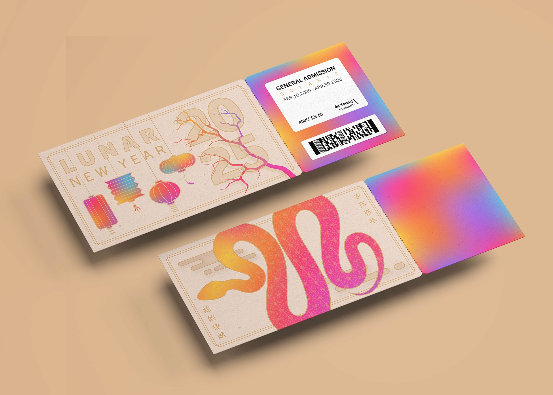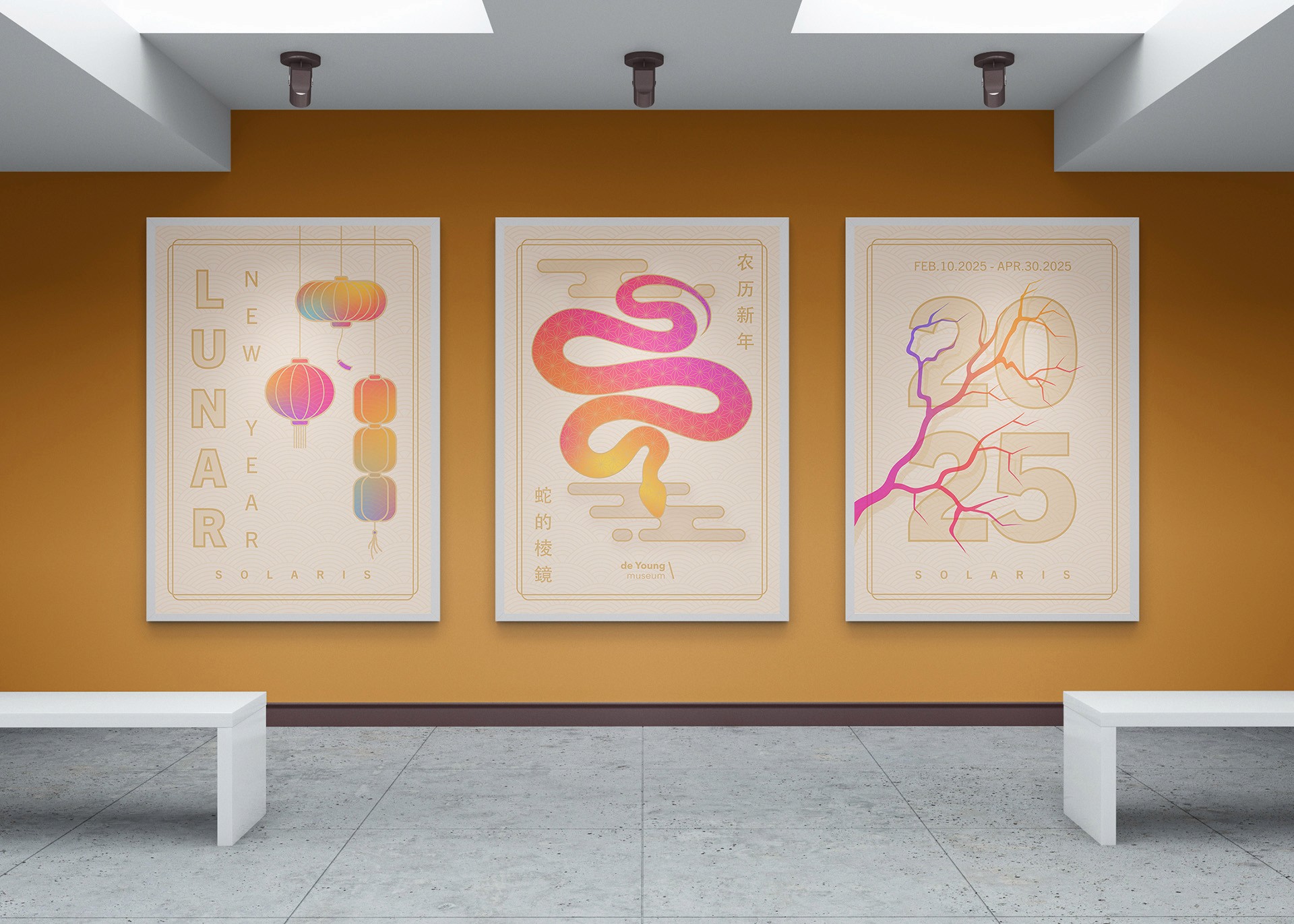 This project explores a visual identity for a Lunar New Year exhibition at the de Young Museum in San Francisco. I created a typographic and graphic system designed to work across posters, exhibition signage, and promotional materials. The design combines celebratory symbolism with strong visual hierarchy to remain clear at both gallery and city scale. The result is a lively identity that guides visitors while capturing the energy of the festival.